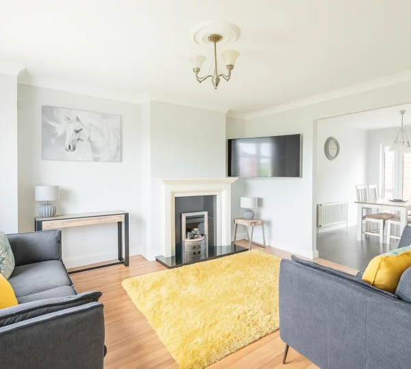 Living Area: Bright, welcoming space with cozy seating, a flat-screen TV, and modern decor — perfect for relaxing after a day out exploring the city.